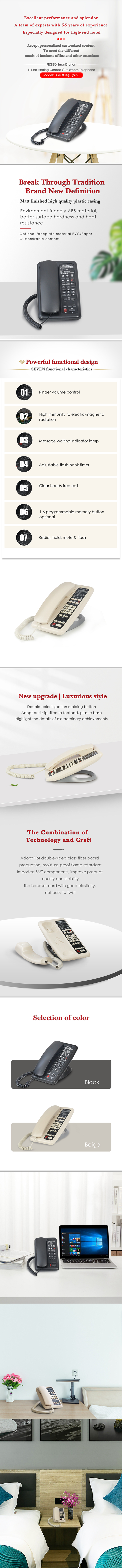 The FG1080A guestroom corded telephone is crafted for modern hospitality needs, combining durability, functionality, and aesthetics. It features advanced surface mount technology with CPU control for stable performance. The full-length customizable faceplate allows hotel branding, while the message waiting indicator enhances guest communication. With one programmable memory button and high resistance to electro-magnetic interference, this phone ensures clear, uninterrupted calls. Its matte-finished design complements any hotel room décor, making it a perfect choice for premium guest experiences.