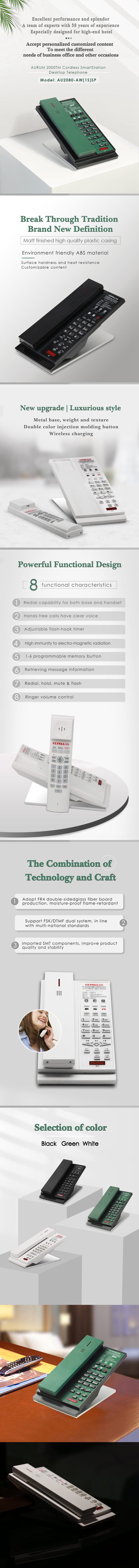 The AU2080W guestroom cordless telephone offers hotels a seamless communication experience with advanced functionality. It features redial capacity for both the base and handset, ensuring convenience for guests. The hands-free call function delivers crystal-clear voice quality, while adjustable flash-hook time enhances call flexibility. With 1-6 programmable memory buttons, hotels can provide quick access to essential services. Built with high immunity to electromagnetic interference, this phone ensures stable performance. Additional features include message retrieval, redial, hold, mute, and ringer volume control. Made from eco-friendly ABS material, it combines durability with sustainability, making it an excellent choice for modern hotels.